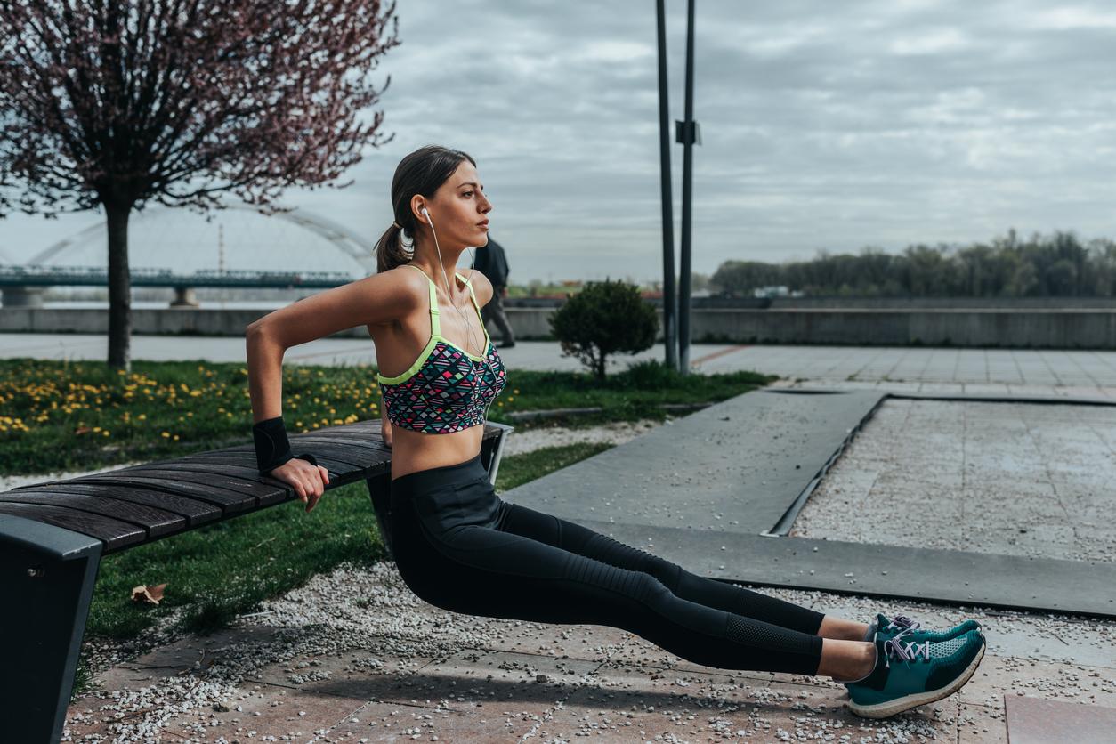 - Cuando estés bien apoyado/a, tendrás que ir subiendo y bajando tu cuerpo, flexionando y estirando los codos con cada movimiento para que trabajen solamente tus tríceps. Repite el movimiento doce veces y descansa durante unos segundos antes de realizar dos series más.