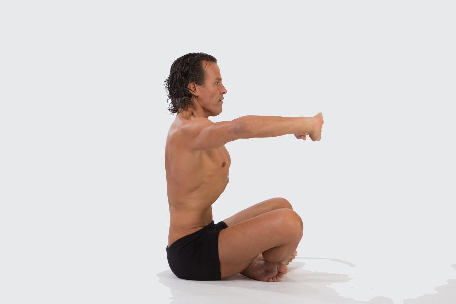 - Inhala profundamente, contrae el abdomen y haz fuerza con los codos, como si quisieras unirlos.