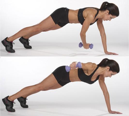 Tendrás que colocarte de forma paralela al suelo, apoyándote con la punta de los pies y con la palma de una mano; con la otra, sujetarás una mancuerna. Tendrás que ir moviendo el brazo dejándolo recto hacia el suelo y elevarlo siguiendo un arco de 90 grados, después, vuelve a la posición inicial y repite 15 veces este movimiento durante 3 series.