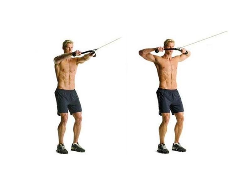 - De pie frente a la polea rotativa, flexiona levemente las rodillas, separa las piernas de modo que los pies cubran un ancho levemente superior al de tus hombros y sujeta con ambas manos los extremos de la cuerda.