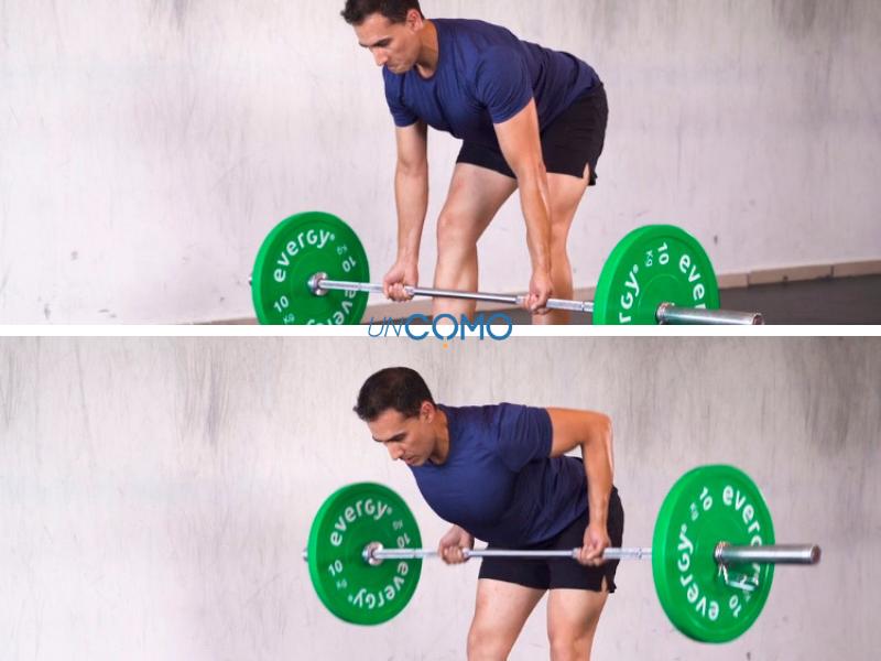 - Baja la barra lentamente hasta más abajo de las rodillas, conservando el torso firme y sin agachar la cabeza.
