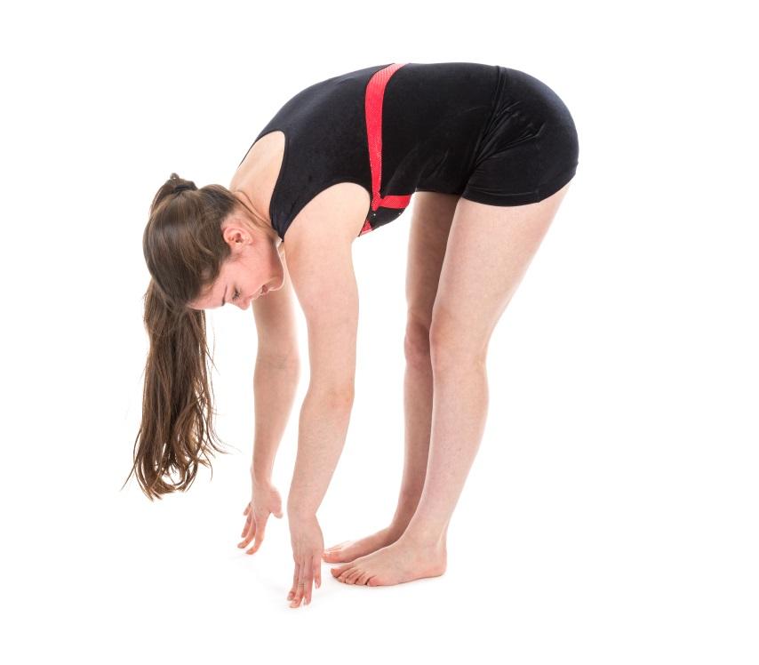 - Las manos tienen que apoyarse en el suelo. Si no se llega sin tener que forzar la espalda, se toca la superficie con los dedos.