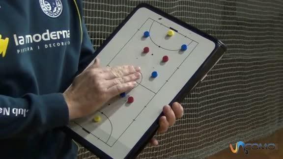 Aprende con Paco Cachinero, entrenador de fútbol sala los secretos de este deporte, en este vídeo os explicamos como salir de una presión defensiva en fútbol sala. Para hacer una presión en fútbol sala marcaríamos al hombre los tres jugadores y el tercero ocuparía una posición más flotante buscando cortar un pase de balón, esta es la posición básica de presión. Para salir de la presión deberíamos colocar los jugadores para que el pase de portero fuera fácil, para ellos pondremos los jugadores bien abierto y muy estirados para generar un gran espacio.
