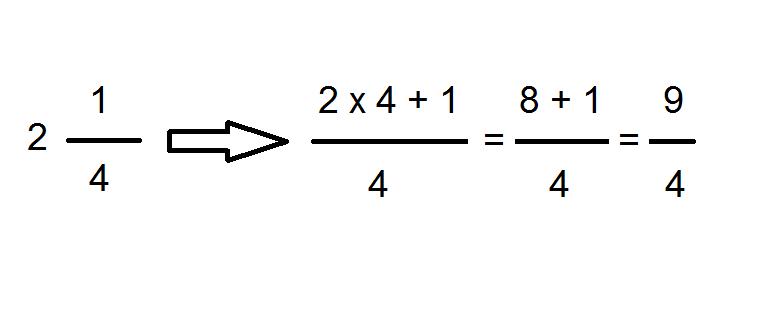Es decir, en nuestro ejemplo mantendremos 4 como denominador y multiplicaremos el 2 por 4 y le sumaremos 1, de modo que la fracción impropia volverá a ser 9/4.