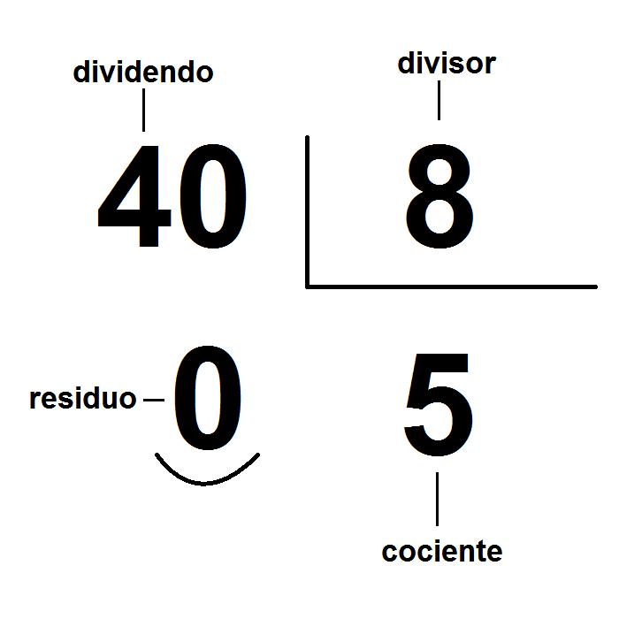 Cada término tiene su nombre: 40 es el dividendo, 8 el divisor, 5 el cociente y el residuo o resto es 0 por tratarse de una división exacta, sin decimales.