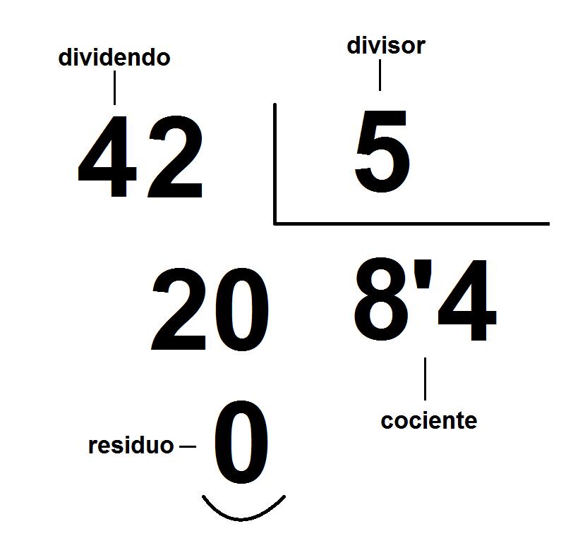 Si queremos encontrar el resultado exacto de la división anterior, es decir, con resto cero, será necesario añadir decimales. Para ello, pondremos una coma a continuación del cociente (ejemplo: 8' ) y añadiremos un 0 al residuo o resto. De esta forma, ahora dividiremos 20 entre 5, que da 4 y el resultado de la división será: 8'4.