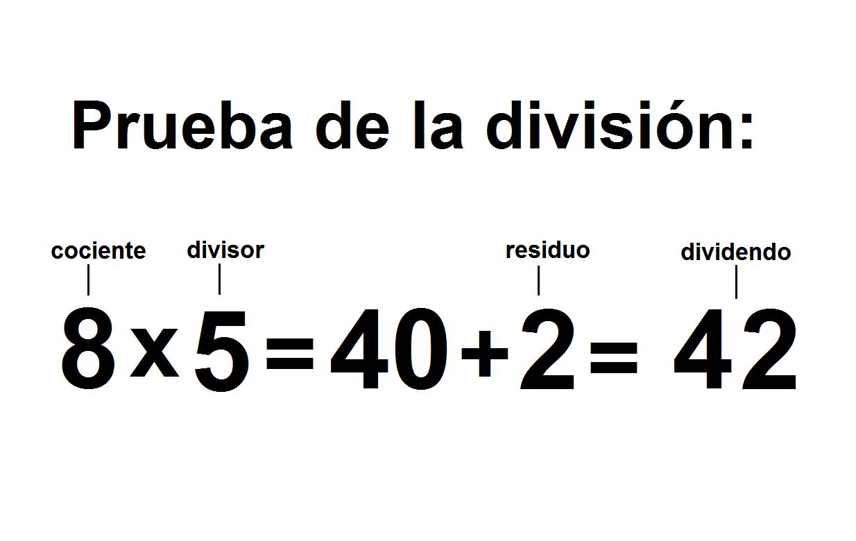 Para hacer la prueba de la división y confirmar que está bien realizada, deberemos multiplicar el cociente por el divisor y le sumamos el residuo o resto para obtener como resultado el dividendo.