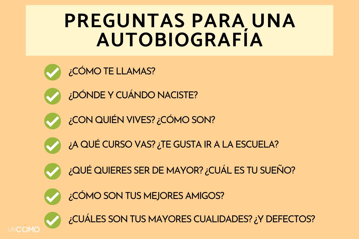 El objetivo de la autobiografía es poder realizar un recorrido por la vida del niño para que este aprenda a destacar aquellos momentos o experiencias más importantes para él o ella. Desde unCOMO recomendamos intentar resolver una serie de preguntas que podrán servirle como guía durante todo el relato. Te mostramos algunos ejemplos de cómo hacer una autobiografía con las preguntas más comunes e interesantes.