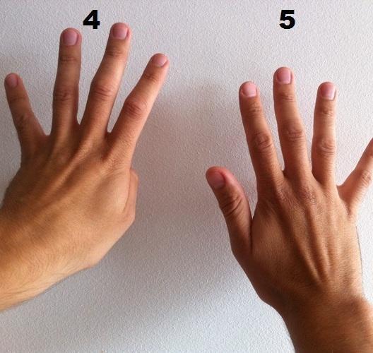 A la pregunta de 9x5, tenemos que decirle al niño que doble el dedo nº 5 (dedo pulgar de la mano izquierda). Entonces el resultado de la multiplicación será siempre la cantidad de dedos que quedan a la izquierda del dedo doblado, quedan 4 dedos a la izquierda, seguido de la cantidad de dedos que quedan a la derecha del dedo doblado, quedan 5 dedos a la derecha, es decir el resultado es 45.