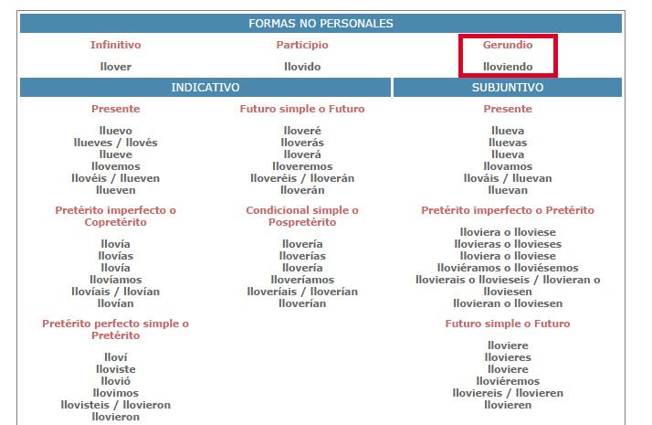De este modo, será totalmente incorrecto escribir o decir "*lluviendo", puesto que se trata de una forma verbal inexistente. Como apuntábamos, la duda puede surgir a raíz de que se trata de un verbo irregular y su conjugación en presente es llueve.