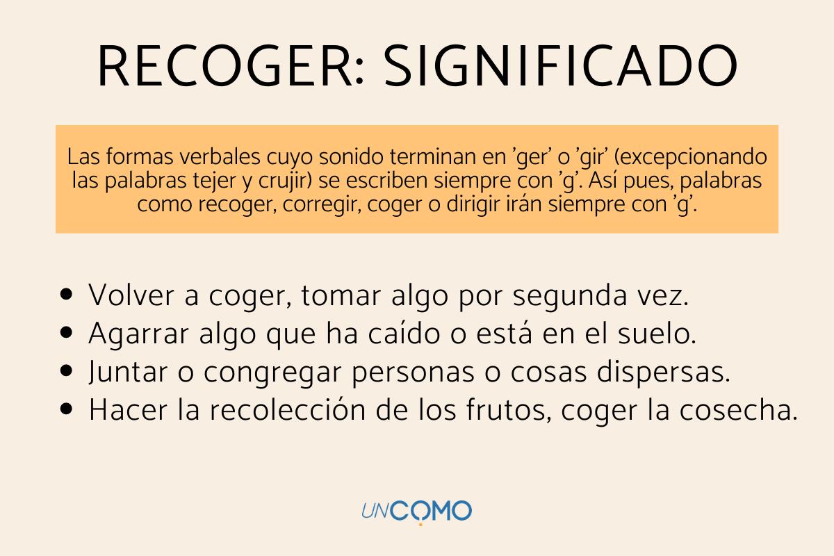 ¿Por qué se escribe recoger con 'g'? Muy sencillo: la norma ortográfica indica que las formas verbales cuyo sonido terminan en 'ger' o 'gir' (excepcionando las palabras tejer y crujir) se escriben siempre con 'g'. Así pues, palabras como recoger, corregir, coger o dirigir irán siempre con g.