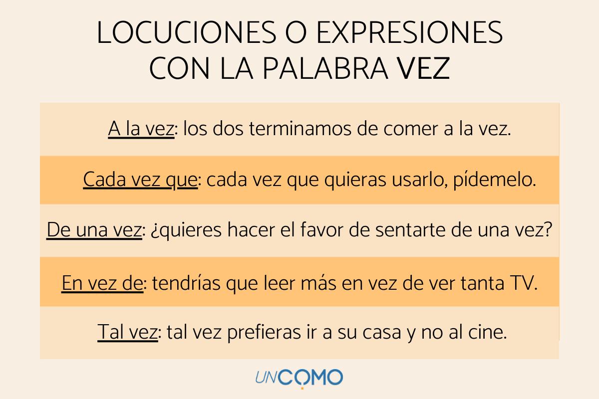 Existen también algunas locuciones, es decir grupos de palabras con un único significado, que incluyen la palabra vez, siempre terminada con "z". Aquí tienes algunas de ellas y algunos ejemplos: