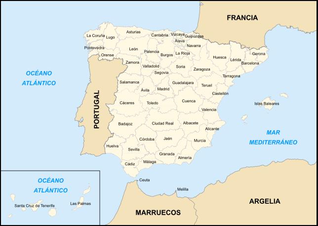 - ANDALUCIA: Almería, Granada, Córdoba, Jaén, Sevilla, Málaga, Cádiz y Huelva. Capital: Sevilla