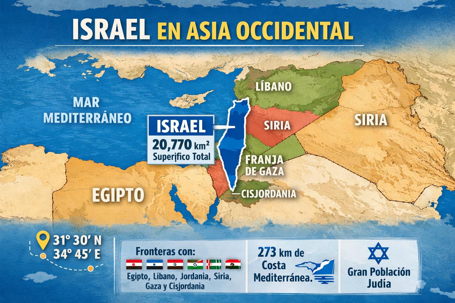 Israel es uno de los países con mayor relevancia geopolítica en los últimos años, especialmente debido a los conflictos bélicos en la región. Por ello, conocer su ubicación en el mapa mundial resulta clave para comprender su influencia y contexto geográfico en Oriente Medio, incluyendo sus fronteras terrestres y marítimas. Se encuentra en el Medio Oriente y limita al norte con Líbano, al noreste con Siria, al este con Jordania y el mar Muerto, y al oeste con la franja de Gaza. Muchas personas se preguntan ¿Israel pertenece a Europa?, pero geográficamente forma parte de Asia, concretamente de la región del Medio Oriente.