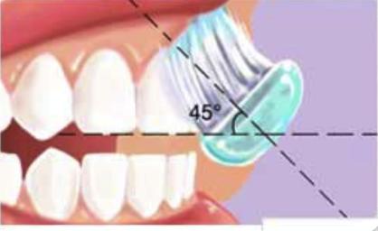 Inserta el cepillo de dientes en la boca y mantenlo en un ángulo de 45 grados contra las encías. Como ves en la imagen los 45º grados es una posición muy adecuada para limpiar bien los dientes y también las encías.