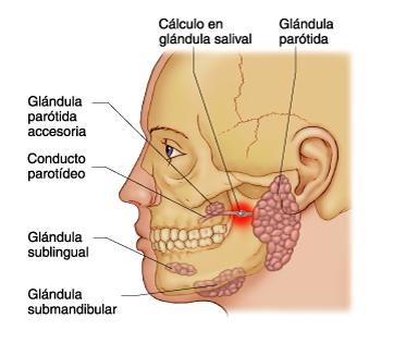 La glándula salival más voluminosa es la parótida, ubicada por debajo del arco cigomático, por delante de la apófisis mastoides y detrás de la rama de la mandíbula. Se relaciona con las ramas principales del nervio facial. Dentro de su substancia asciende la arteria temporal superficial. La secreción de la glándula parótida es de tipo seroso (fluída).