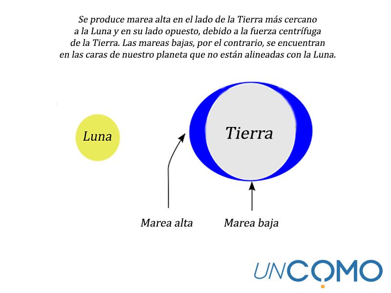 Teniendo esto en cuenta, entendemos que cuanto más cerca esté la Luna, mayor será la fuerza de gravedad y, por lo tanto, en el lado de la Tierra más cercano a la Luna (así como en su lado opuesto, debido a la fuerza centrífuga de la Tierra) se dará la marea alta (pleamar), mientras que en los lados más alejados, habrá marea baja (bajamar).