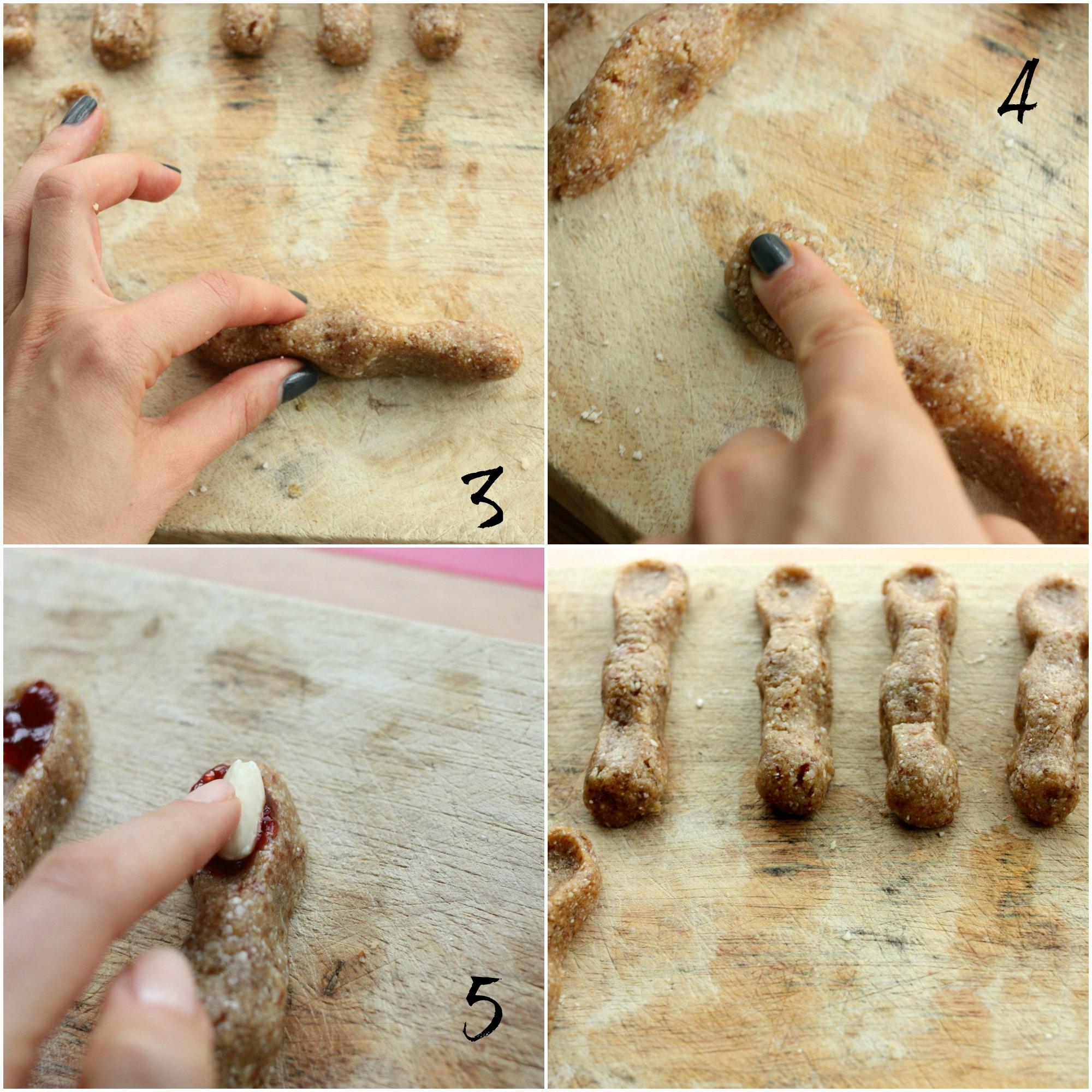 ¡Perfecto! Ahora ya tenemos la masa para elaborar nuestros dedos de bruja. Cogemos un poco y tratamos de darle forma con la mano abierta para conseguir que la masa se alargue y estreche. Una vez hemos logrado una estructura similar al dedo, apretamos con uno de nuestros dedos en lo que será la uña, con el objetivo de que se ensanche consiguiendo el aspecto del dedo de una bruja.