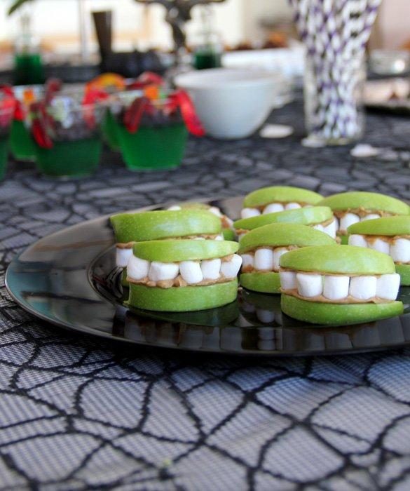 Cortamos las manzanas en rebanadas. Para hacerlo, sitúa la manzana sobre una superficie en su posición normal y con un cuchillo corta de arriba abajo de forma paralela tratando de simular la forma de una luna menguante, ya que es lo que otorgará el aspecto de dentadura. Colocamos mantequilla de cacahuete sobre cada ambo de la manzana que estarán en contacto y sobre estos agregamos los malvaviscos o nubes simulando los dientes. ¡Preparado! Ya tenemos una excelente receta fácil y rápida para celebrar Halloween.