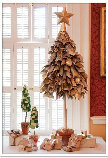 Otra excelente alternativa de decoración navideña para los ecológicos: un árbol de Navidad hecho completamente en periódico y luego pintado de dorado. Un trabajo hermoso con un resultado final atractivo y perfecto para los hogares con decoraciones sencillas pero llenas de encanto.