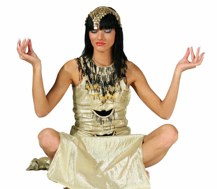 Para elaborar la túnica egipcia, necesitarás una sábana o tela blanca, aunque también podría servirte tela de color beige o incluso dorada. Tan solo deberás enroscarla alrededor de tu cuerpo y sujetarla con un nudo, un broche o, si lo prefieres, coserla con unas puntadas para que quede más sujeta. No olvides hacer un agujero lo suficientemente amplio en la parte superior para poder sacar la cabeza sin problemas. Si dispones de un vestido blanco o beige sencillo, tipo playero pero que sea largo, también puede servirte para hacer un traje de egipcio casero.