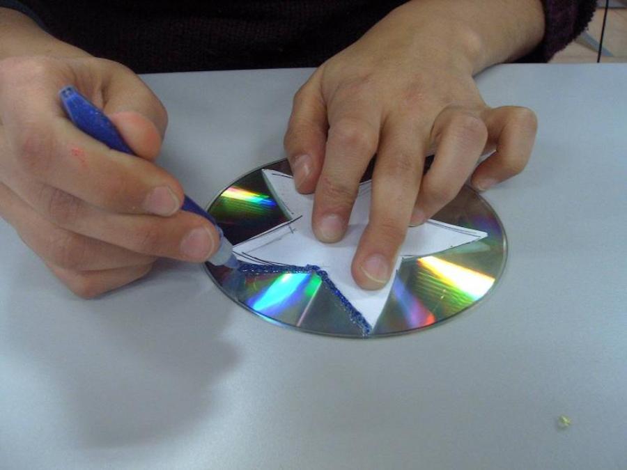 Adornos con CD. Los adornos brillantes se ven excelentes en el árbol de navidad, así que utilizaremos CD's viejos para crearlos. Dibuja sobre este una estrella, un corazón o lo que desees y luego recórtalos y añádele una cinta o hilo para colgarlo. Puedes aplicar algunas de las ideas que te presentamos en nuestro vídeo cómo hacer adornos de navidad con CD's.