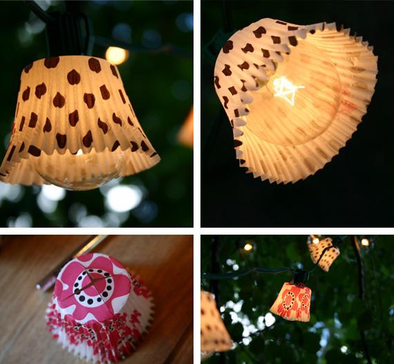 Luces con papeles de magdalenas. Otra forma de hacer adornos de navidad sin gastar mucho dinero es comprar los papeles para realizar magdalenas, son muy económicos y los hay de varios colores. Realiza un pequeño orificio con un la tijera e introduce una pequeño foco de las luces de Navidad de afuera hacia adentro.