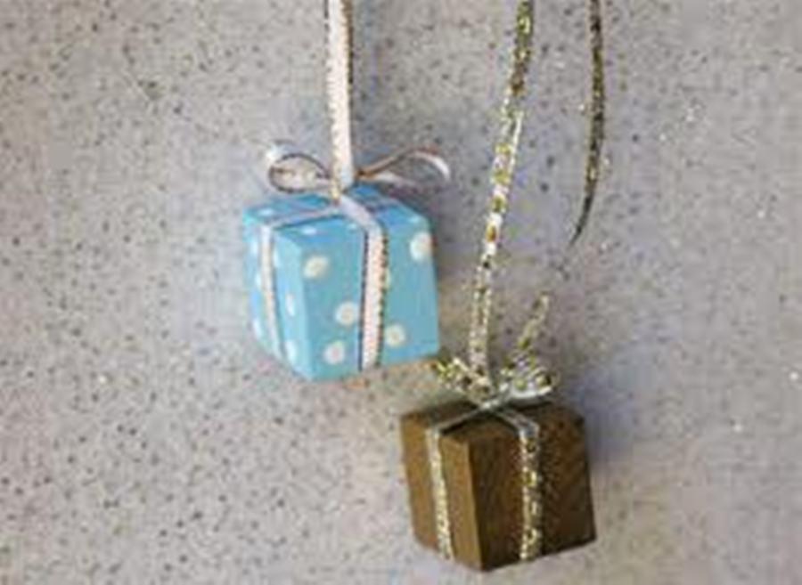 Regalos con cajitas. En navidad se realizan muchos regalos, por eso en el árbol no pueden faltar pequeños paquetes que los simulen. Utiliza cajitas de medicamentos, de alimentos, etc. envuélvelas con papeles brillantes como si estuvieras envolviendo un regalo de verdad. Luego, para decorarlas utilizaremos una cinta del color que nos guste, con la cual envolveremos la caja realizaremos un lazo con la misma dejando unos cuantos centímetros de más para poder colgarlo en el pino navideño.