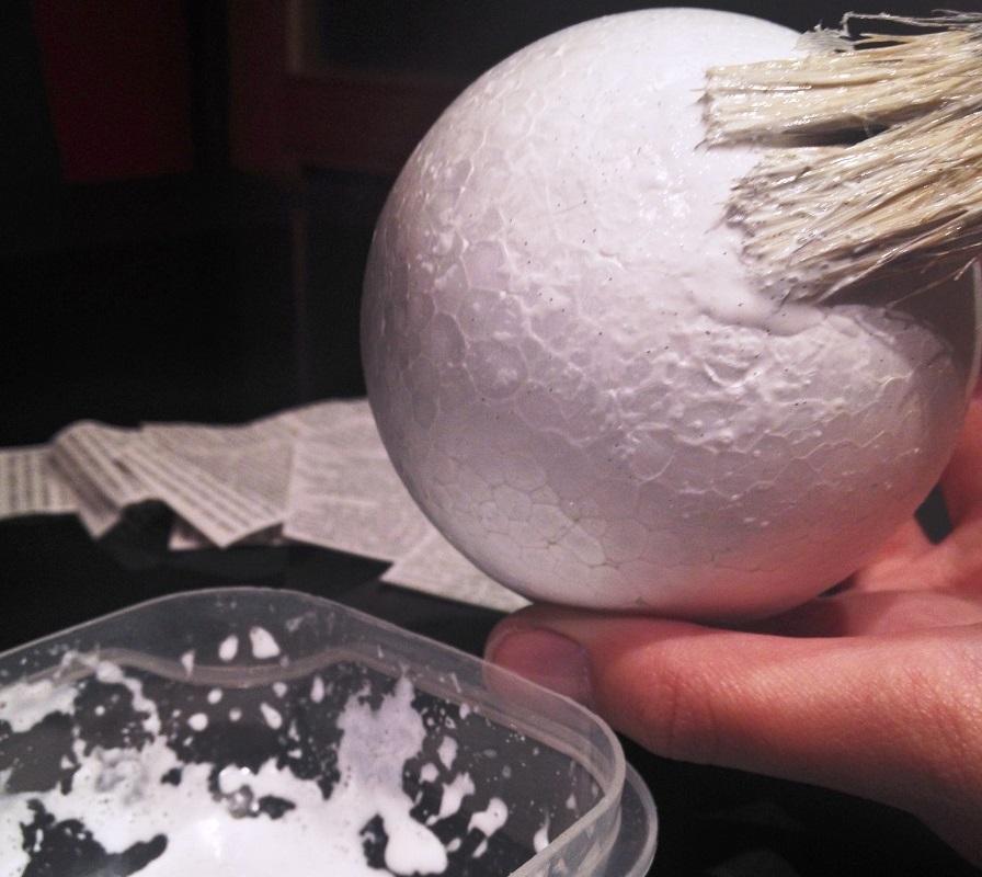 Primero, en un pequeño recipiente, diluye la cola blanca con un poco de agua y remueve hasta obtener una mezcla homogénea. Ahora, coge la bola de porexpan y, con la ayuda de un pincel, aplica la mezcla de cola blanca por toda la superficie dando ligeros toques y sin excederte. De este modo, será más fácil pegar, a continuación, el papel de periódico.