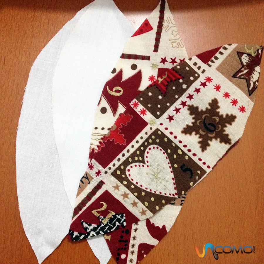 Luego, coge la plantilla y corta los trozos de tela que vayas a necesitar. En nuestro caso, vamos a dividir la bola en 4 particiones, asi que hemos cortado 2 trozos de tela roja y otros 2 de tela estampada.