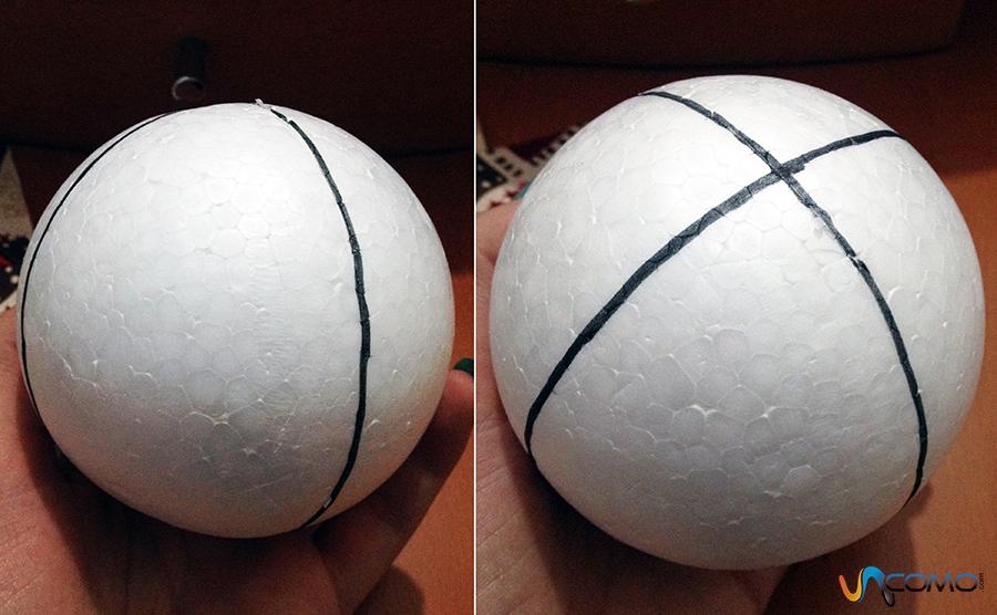 Después, dibuja sobre la bola de porexpan los triángulos, óvalos, cuadrados, etc., para saber dónde debes colocar la tela de tu bola para Navidad. Como ves, hacer bolas de tela para el árbol de Navidad no es tan complicado. Solo necesitas un poco de tiempo e imaginación.