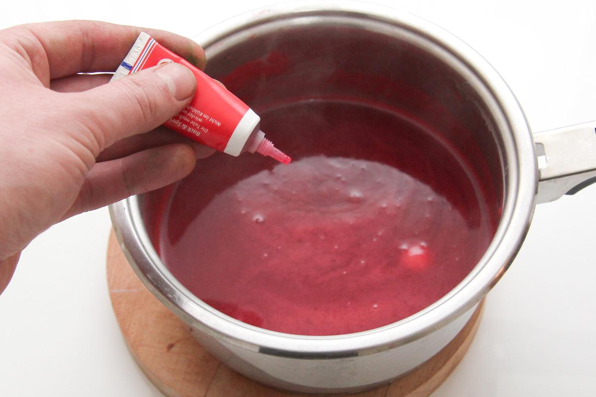 - Si crees que es demasiado rojo y claro, agrega una gotita de colorante azul y vuelve a mezclar.