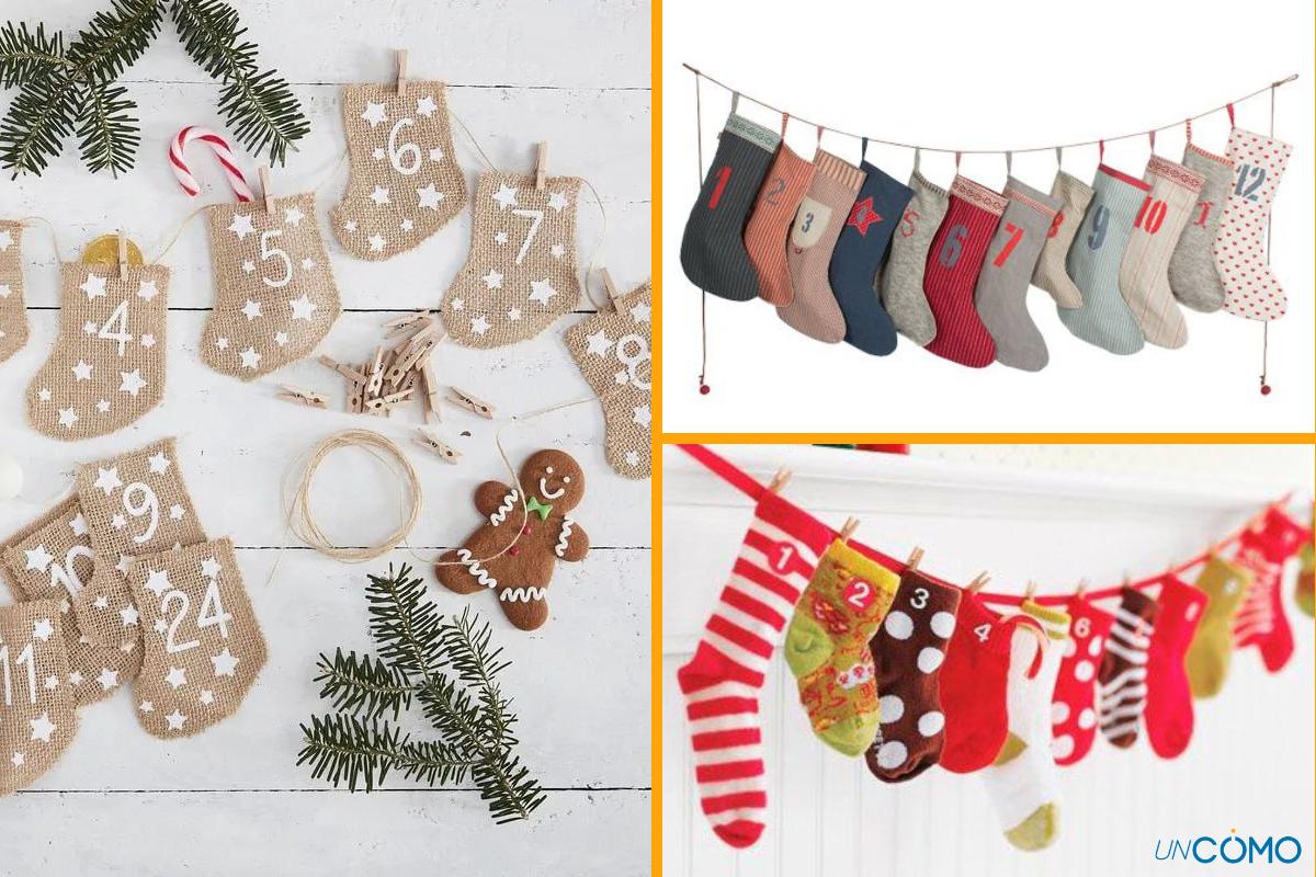 Si tienes claro qué quieres meter dentro de esta cuenta atrás a modo de sorpresa, queremos darte una opción para preparar esta manualidad de calendario de Adviento. Una opción divertida es hacerlo mediante calcetines de Navidad. Para que el calendario de aviento sea casero puedes coser bolsitas en forma de calcetín y dibujar en ellas motivos decorativos, como estrellas, donde irán señalados los números del 1 al 24. Puedes disponer los calcetines en una bandeja e introducir en ellos una pequeña sorpresa que será revelada día a día hasta llegar al día de Navidad. ¡Emocionante y muy bonito!