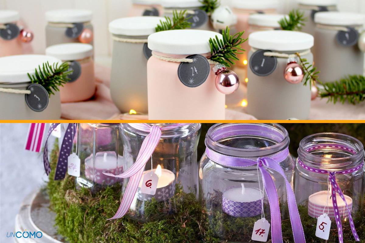 Si no quieres esconder ninguna sorpresa en el interior y quieres rememorar los calendarios de Adviento originales, te damos esta bonita opción: usar tarros de cristal con velas en su interior. Tan solo deberás recopilar 24 botes de cristal, no hace falta que sean iguales, sino que pueden ser de distintas formas y tamaños. Coloca en cada uno de ellos cintas de colores o de cordel en la parte superior donde etiquetaremos los tarros con la numeración correspondiente. Luego, coloca en su interior distintas velas aromáticas que deberás ir encendiendo día a día. Una opción decorativa y original para un calendario de Adviento único.