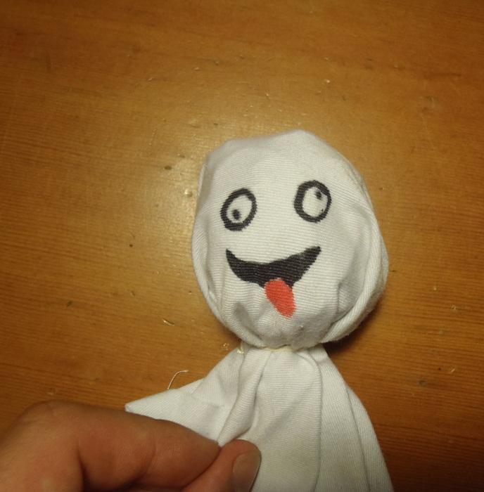 Ahora ya tienes el fantasma volador hecho, pero si quieres que quede más real y divertido, le puedes dibujar la cara, haciendo alguna mueca o lo que tu quieras, con rotuladores permanentes. En nuestro caso hemos utilizado dos colores, el negro para hacer los ojos y la boca, y el rojo para hacer la lengua. Pero tu puedes hacer lo que te apetezca.