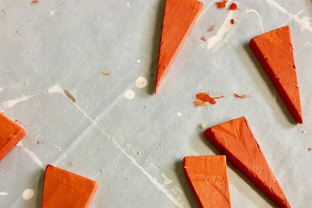 Siguiendo con las cartulinas, es hora de hacer los ojos, la nariz y la boca. Tradicionalmente, la nariz del muñeco de nieve es una zanahoria, por lo que te animamos a hacerla con cartulina naranja, en forma de triángulo. Sin embargo, otra gran opción es cortar triángulos pequeños de plastilina naranja para hacer una nariz más realista. ¡Usa tu imaginación!
