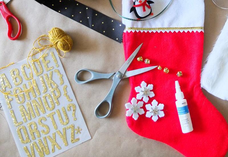 También puedes optar por añadir adornos a los calcetines navideños o incluso personalizarlos con el nombre de cada miembro de la familia. Para ello, usa fieltro de otros colores o pegatinas que ya vengan en forma de letras y pégalas o cóselas sobre tu bota de Navidad.