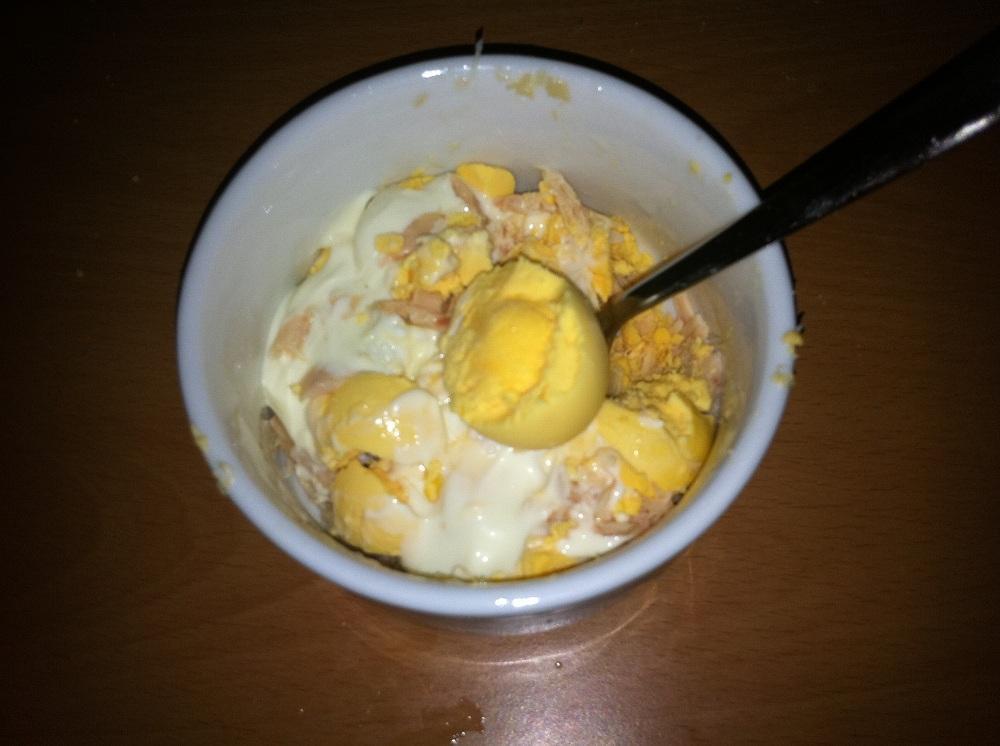 Añade en el mismo bol la mayonesa y el atún a tu gusto y mézclalo todo bien hasta que quede una masa compacta.