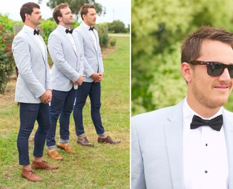 Los novios pueden ir vestidos con un tradicional traje, pero olvídate del chaqué o del esmoquin. Lo ideal es un traje tradicional con corbata y puedes hacer de tu look algo más hippie con una flor en la solapa o incluyendo un complemento que rompa con los colores del traje. Por ejemplo, en los zapatos.
