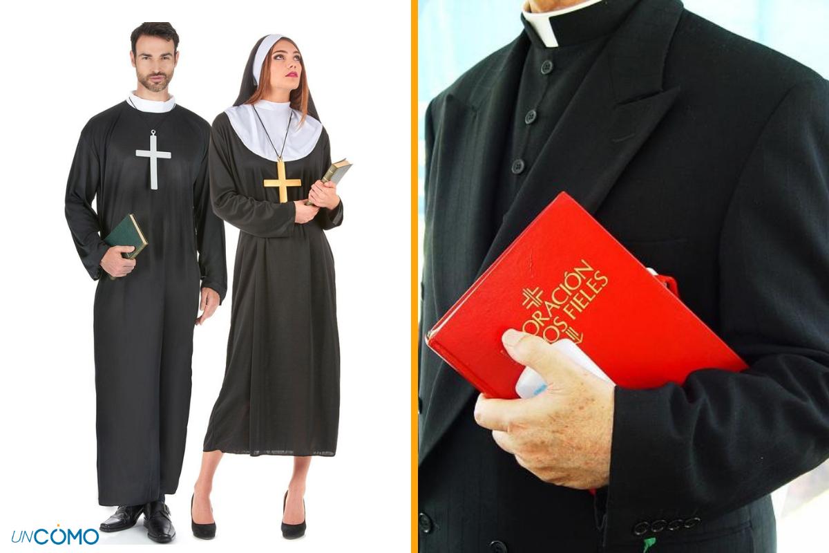 La ropa negra también es la base para crear este disfraz casero de sacerdote. Para acabar de redondear tu disfraz de cura será imprescindible que te hagas con algunos complementos como un alzacuellos, una cruz o una Biblia. Este es otro de los disfraces originales caseros para grupos, ya que tus amigos pueden vestirse también de cardenal, sacerdote, monaguillo, monja, etc.