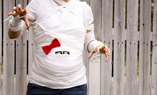 Comenzamos con un disfraz de Halloween para embarazadas totalmente adecuado para esta noche tan especial pero, a su vez, también resulta la mar de divertido. Se trata de envolverte como si fueras una momia pero dejando un pequeño hueco en la zona de la barriga, como si el bebé sacara los ojos por ahí. Para dar este efecto, tendrás que dibujar dos ojos con la ayuda de un rotulador o, si lo prefieres, puedes hacer un dibujo más realista.
