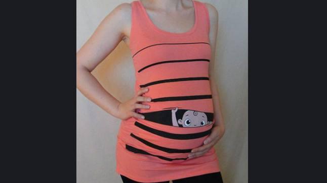 El color naranja es el color de Halloween porque recuerda al color de la calabaza, uno de los elementos imprescindibles del día de los muertos. Aprovechando este tono, puedes decorar tu camiseta y conseguir un disfraz para embarazadas muy divertido y original. Como puedes ver en la imagen, puedes dibujarte en la camiseta unas líneas y, dentro, hacer la silueta de un niño que quiere escapar de la cárcel que tiene en la barriga.