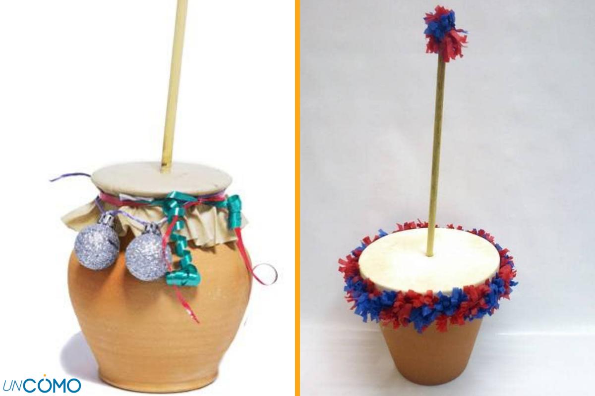 Realizar este instrumento musical con manualidades es fácil, ya que te puede valer una simple maceta que ya no utilices. Solo tienes que recubrirla con un paño bien tensado y pegado a sus bordes. Después, haz en el centro un pequeño orificio, busca un palito con el que atravesarlo y, finalmente, arrancar su peculiar sonido a este navideño instrumento musical. Si quieres tener tu zambomba de una manera aún más fácil, tapa la abertura de la maceta simplemente con papel adhesivo, haz el orificio y... a dale a la zambomba mientras cantáis villancicos.