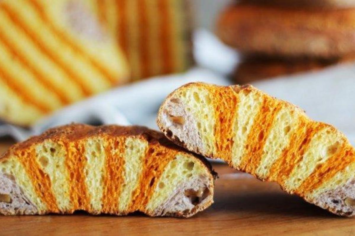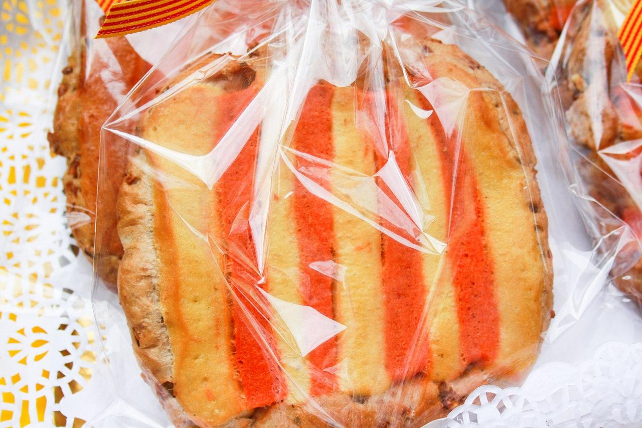 En Catalunya es típico que para el día de Sant Jordi se coma este pan. El pan de Sant Jordi simboliza la senyera catalana con todas sus barras. Es un pan muy sabroso hecho a base de nueces (parte externa del pan), queso (color amarillo) y sobrasada (color rojo).