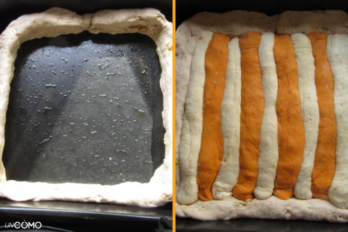 Seguidamente, divide el pan de sobrasada en 4 porciones y el de queso en 5 porciones. Estira cada porción formando tiras de unos 25 cm de largo. Coloca las tiras de pan alternativamente, empezando y acabando con el pan de queso, humedeciendo con agua el pan de nueces y los laterales de los panes de queso y sobrasada. De esta manera, todos los panes quedarán bien unidos cuando fermenten y no se despegarán al hornear.