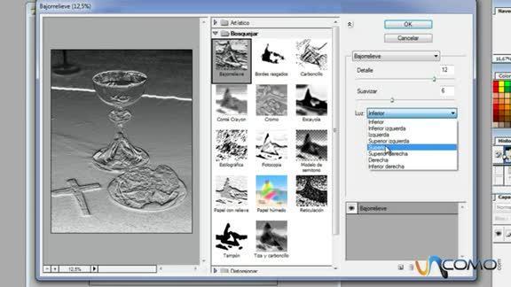 Para empezar la tarjeta de invitación, con la imagen abierta en Photoshop iremos a Filtro. Aquí seleccionaremos Bosquejar y Bajorrelieve. Con esta herramienta, buscaremos dar los valores que nos interesen y la perspectiva desde donde aplicar la luz. Cuando nos guste la imagen en relieve que nos queda, clicaremos sobre aceptar.
