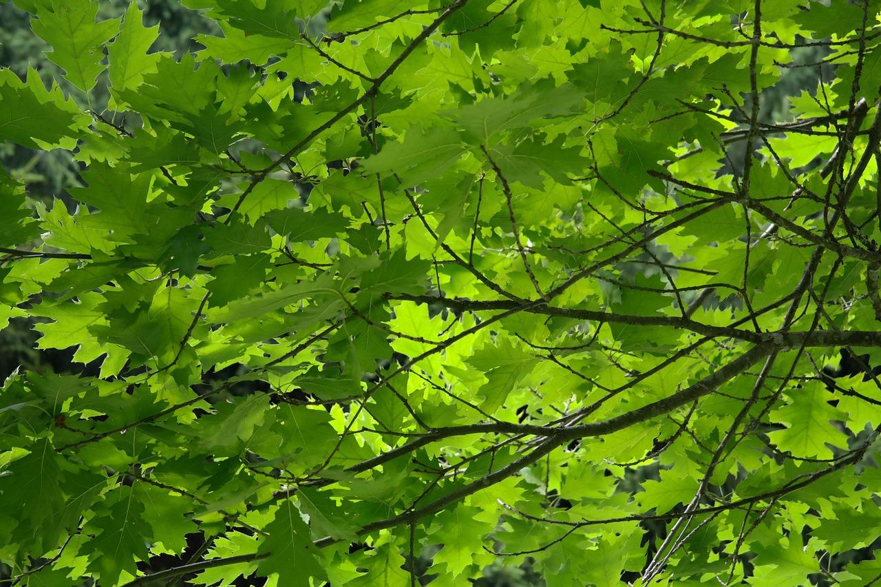Las grandes hojas del roble americano permanecen hasta el invierno. La corteza del árbol es grisácea y agrietada.