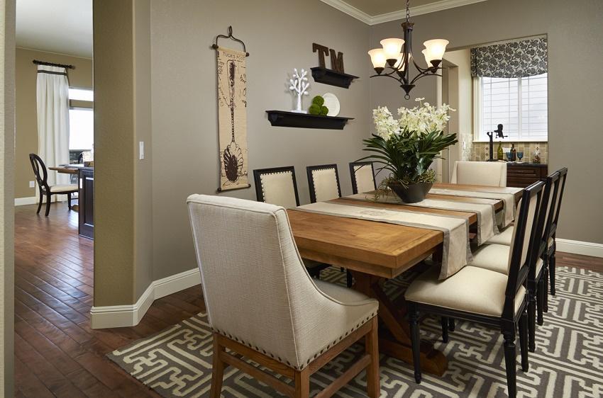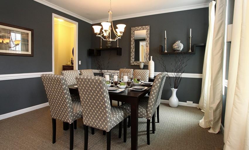 - Si te gusta estar en un comedor elegante para cenar por las noches y tener románticas veladas, entonces una opción excelente sería escoger tonos oscuros y elegantes como el marrón chocolate, el azul marino, caqui, el color canela o el berenjena en combinación con colores como el blanco o el color crema. Estos tonos funcionan muy bien con muebles finos con acabados oscuros, con dorados y si incluyes fundas pálidas, con patrones de tela simples estarás ofreciendo un aspecto clásico pero al mismo tiempo refrescante y muy moderno.