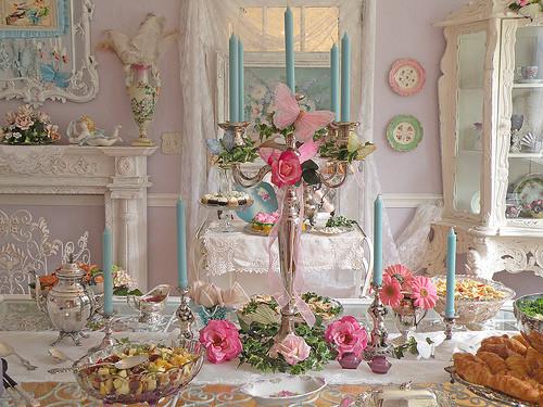 Los artículos de decoración en el estilo shabby chic son principalmente velas y candelabros. Puedes escoger candelabros antiguos y altos para acentuar el toque antiguo y acompañarlos con velas largas en tonos pasteles como el rosado o el azul. Por lo general se suelen colocar en la mesa principal del salón o en algún mueble en la entrada de la casa.
