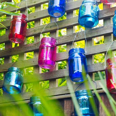 Apúntate esta idea: botellas de colores. Pinta botellas transparentes con colores llamativos o cómpralas en cualquier tienda de decoración. Después llénalas de agua y distribúyelas por el patio. Conseguirás un maravilloso efecto cuando los rayos del sol se reflejen en ellas. También puedes colocar dentro una vela, dará mucho ambiente por la noche.